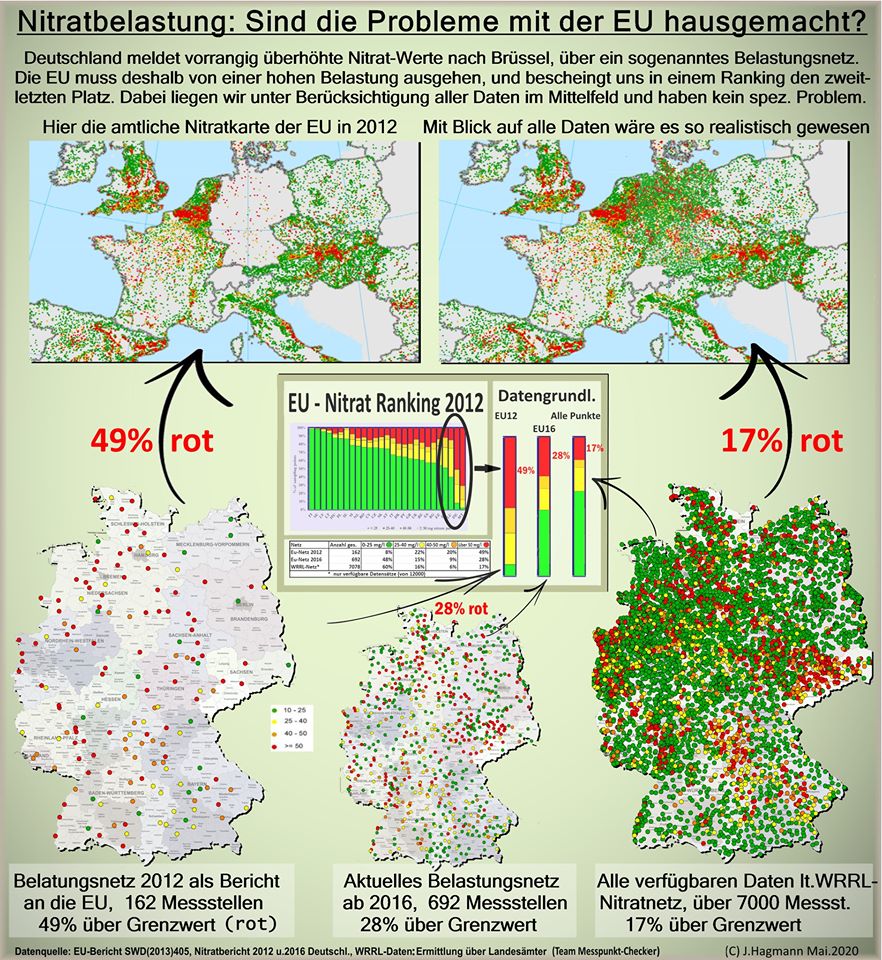 Wir vom Team "Messpunkt-Checker" haben in mühsamer Kleinarbeit die Nitratwerte der Bundesländer zusammengetragen, insbesondere die vom Netz der Wasserrahmenrichtlinie (WRRL-Netz). Wir konnten deutschlandweit über 7000 Datensätze ermitteln. Dadurch haben wir jetzt die Möglichkeit, neue Aussagen zu machen zum Thema "EU- Nitratbelastungsnetz".