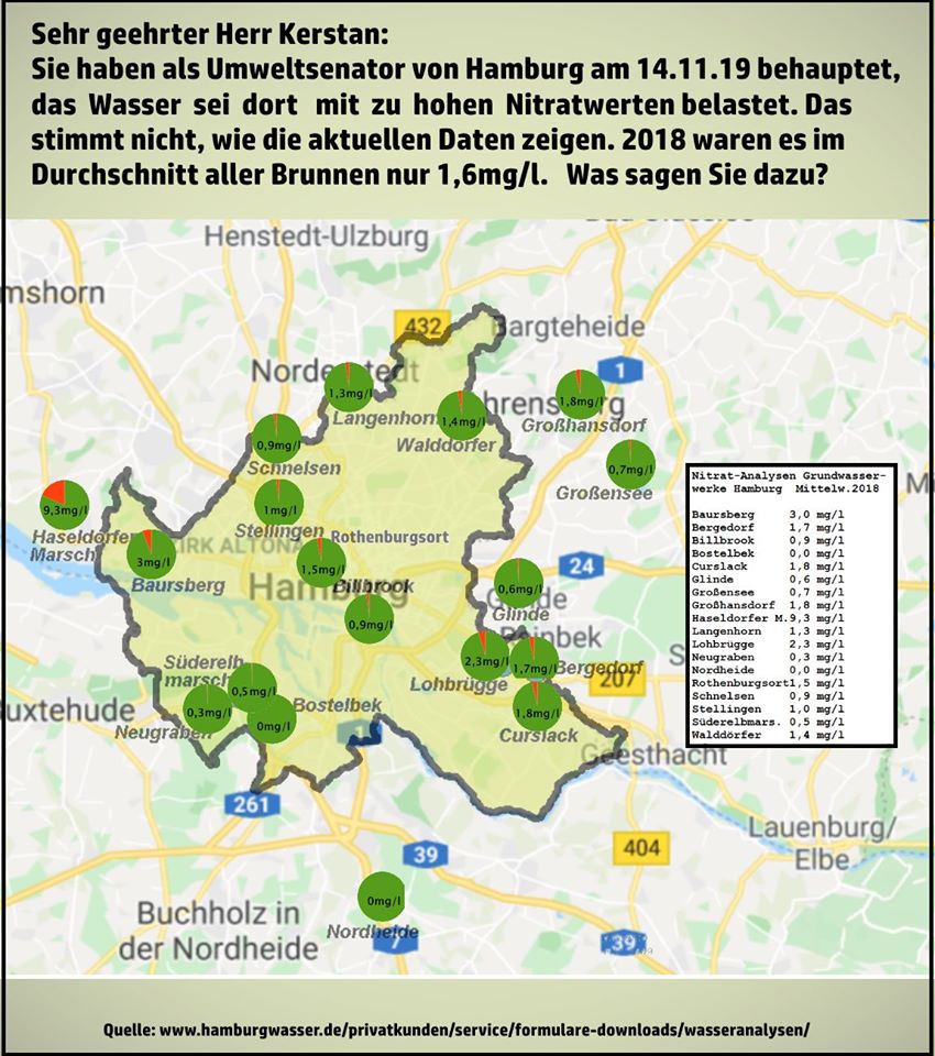 Der Umweltsenator von Hamburg, Jens Kerstan hat bei der Demo am 14.11. auf der Bühne behauptet, das Wasser von Hamburg sei durch die Landwirtschaft mit zu hohen Nitratwerten belastet!